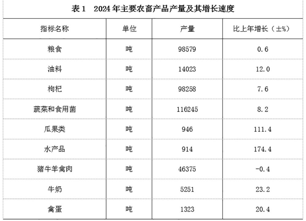 全年农作物总播种面积103.63万亩,较上年增加4.37万亩。粮食作物播种面积33.92万亩,较上年增加1.4万亩。其中,小麦种植11.87万亩,增加0.34万亩;青稞种植17.38万亩,增加0.56万亩;藜麦种植3.74万亩,增加0.21万亩;豆类种植0.41万亩,增加0.26万亩;薯类种植0.53万亩,增加0.04万亩。经济作物^[3]播种面积69.71万亩,较上年增加2.98万亩。其中,油料种植8.92万亩,增加0.75万亩;药材种植43.77万亩,增加1.97万亩(其中枸杞种植43.23万亩,增加1.83万亩);蔬菜及食用菌种植2.88万亩,增加0.19万亩;青饲料种植11.92万亩,增加0.49万亩。全年粮食产量9.86万吨,较上年增产0.06万吨;单位面积产量290.63公斤/亩,较上年减少10.59公斤/亩。