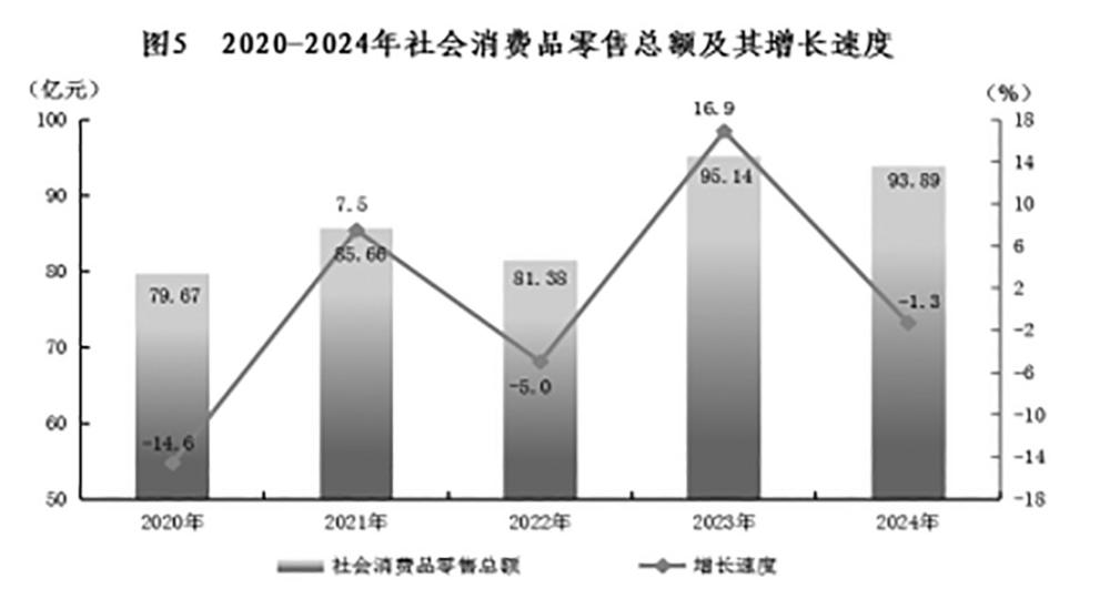 全年社会消费品零售总额93.89亿元,同比下降1.3%。按规模分,限额以上单位零售额44.85亿元,下降10.1%,限额以下单位零售额49.04亿元,增长8.4%;按经营地分,城镇消费品零售额87.83亿元,下降1.7%(其中城区消费品零售额79.29亿元,增长0.3%),乡村消费品零售额6.06亿元,增长4.5%;按消费形态分,商品零售88.92亿元,下降1.7%,餐饮收入4.97亿元,增长5.1%。网络零售额完成15.9亿元,同比增长27.4%。其中,实物商品网络零售额2.9亿元,同比下降23.4%,非实物商品网络零售额13亿元,同比增长49.2%。