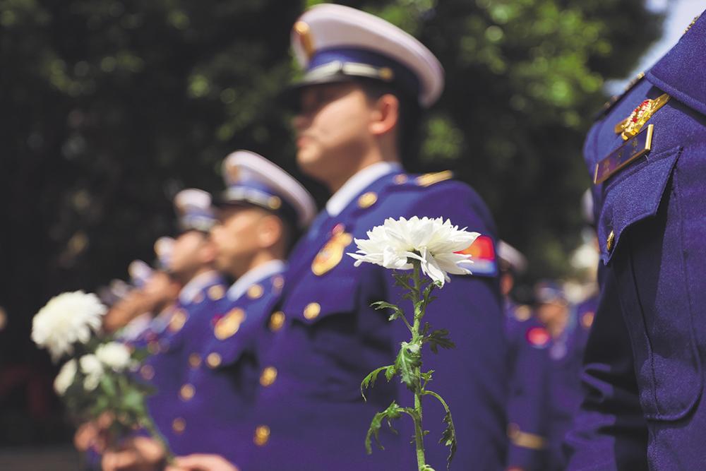↑4月2日,福建省厦门市消防救援支队消防指战员在葫芦山烈士陵园烈士纪念碑前缅怀先烈。 清明节将至,各地举行祭扫活动,缅怀先辈,寄托哀思。 新华社发(曾德猛 摄)