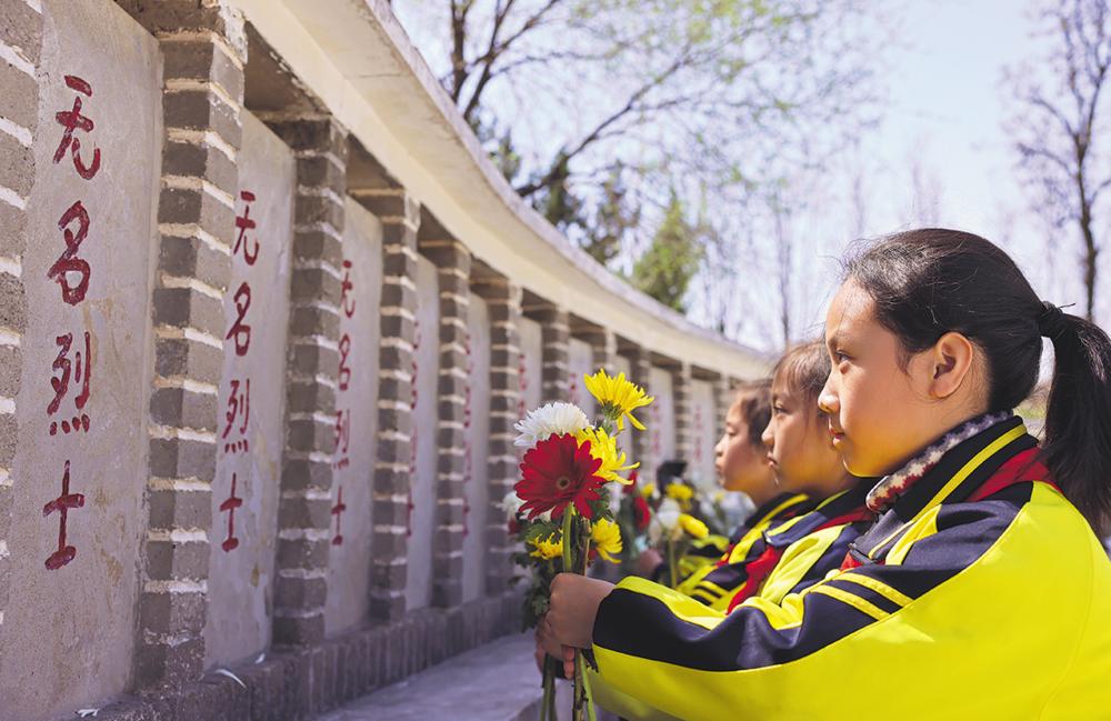 →4月2日,山东省枣庄市市中区文化路小学学生在枣庄革命烈士陵园向无名烈士敬献鲜花。 清明节将至,各地举行祭扫活动,缅怀先辈,寄托哀思。 新华社发(孙中喆 摄)