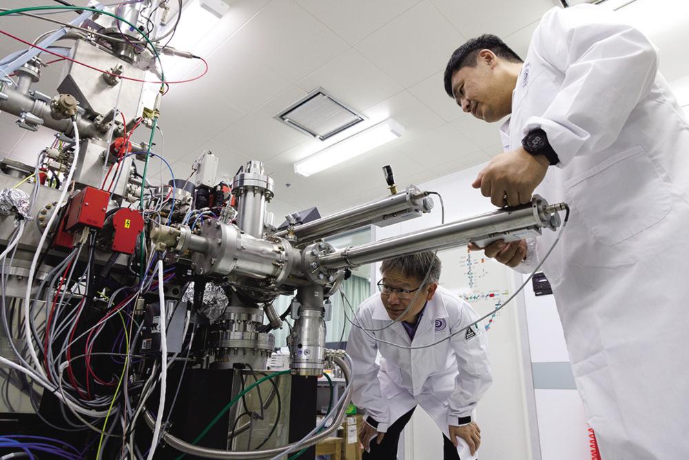 4月8日,在中国科学院地质与地球物理研究所纳米离子探针实验室,胡森研究员(左)、郝佳龙高级工程师放置月球样品。 从中国科学院获悉,我国科学家利用嫦娥六号月球样品,首次测得月球背面月幔的水含量小于2微克/克,表明月球背面月幔非常“干”。此项成果将为更好开展月球起源与演化相关研究提供有力支撑,相关论文已在国际学术期刊《自然》在线发表。新华社记者 金立旺 摄
