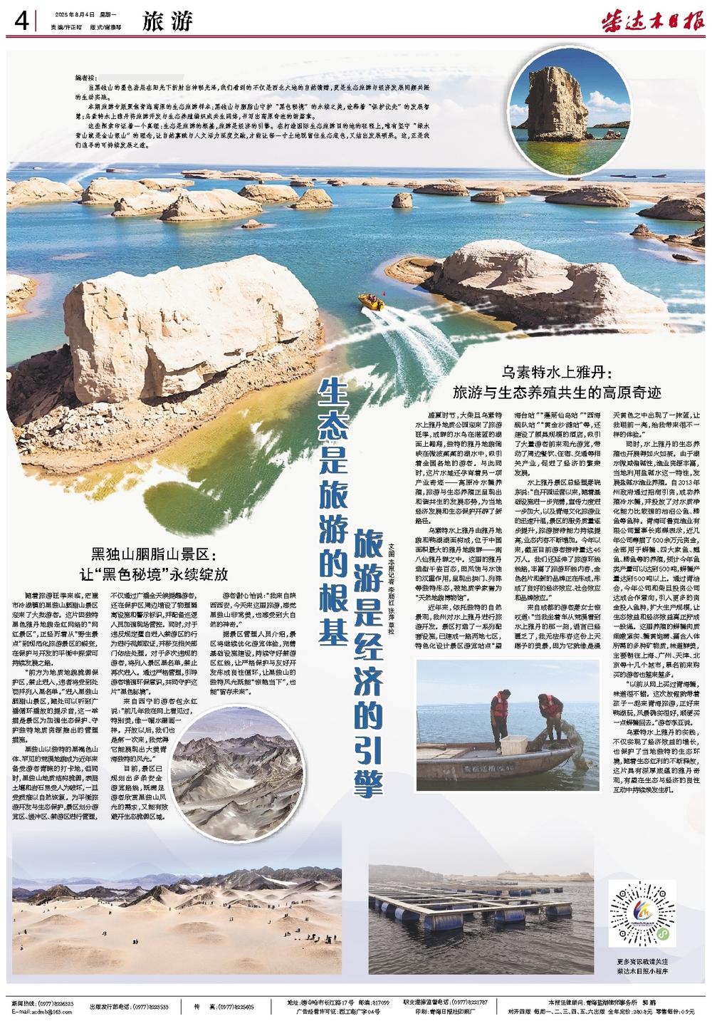 本期旅游专版聚焦青海高原的生态旅游样本:黑独山与胭脂山守护 “黑色秘境” 的永续之美,诠释着 “保护优先” 的发展智慧;乌素特水上雅丹将旅游开发与生态养殖编织成共生网络,书写出高原奇迹的新篇章。