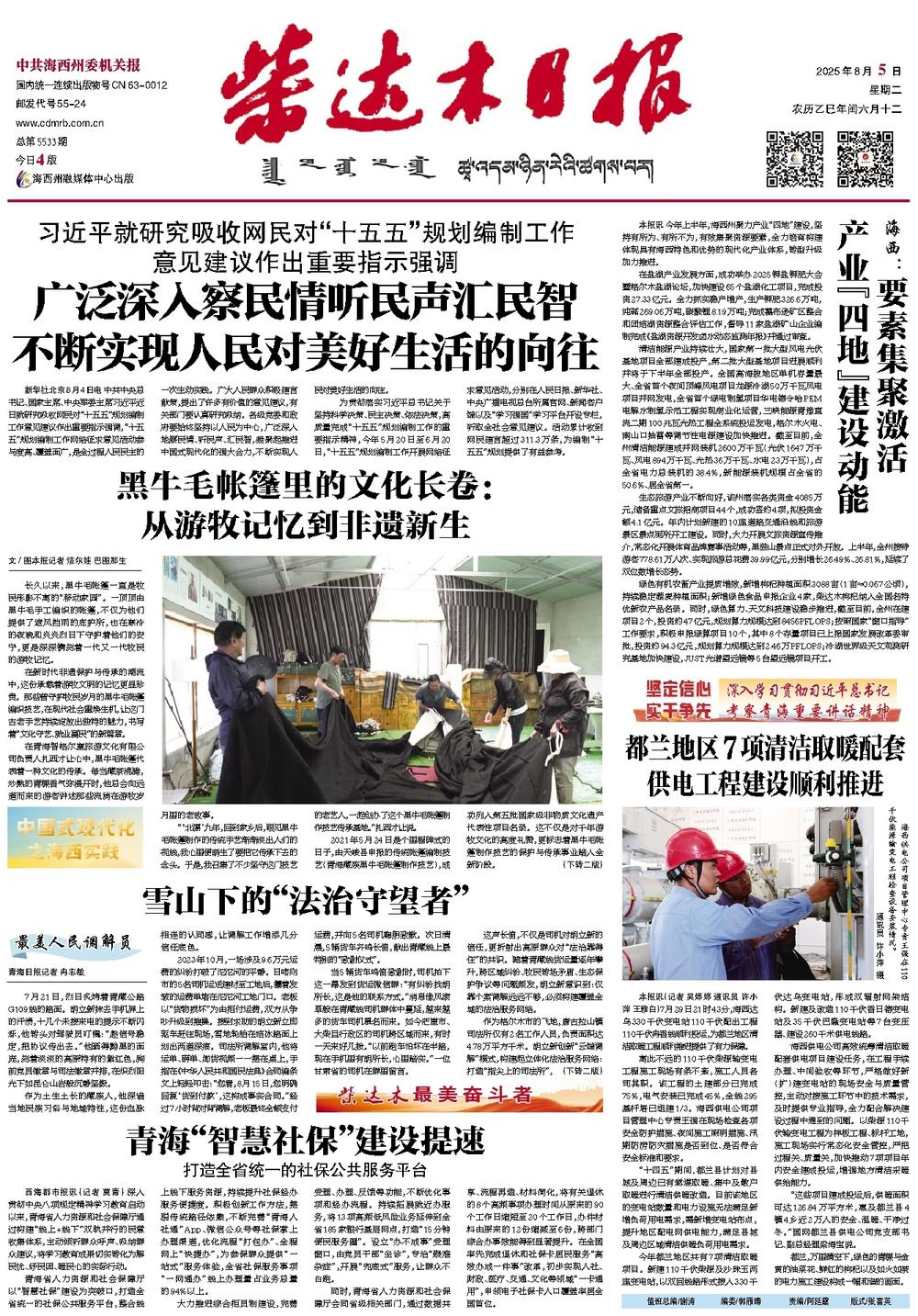 都兰,万里晴空下,绿色的青稞与金黄的油菜花、鲜红的枸杞以及如火如荼的电力施工建设构成一幅和谐的画面。