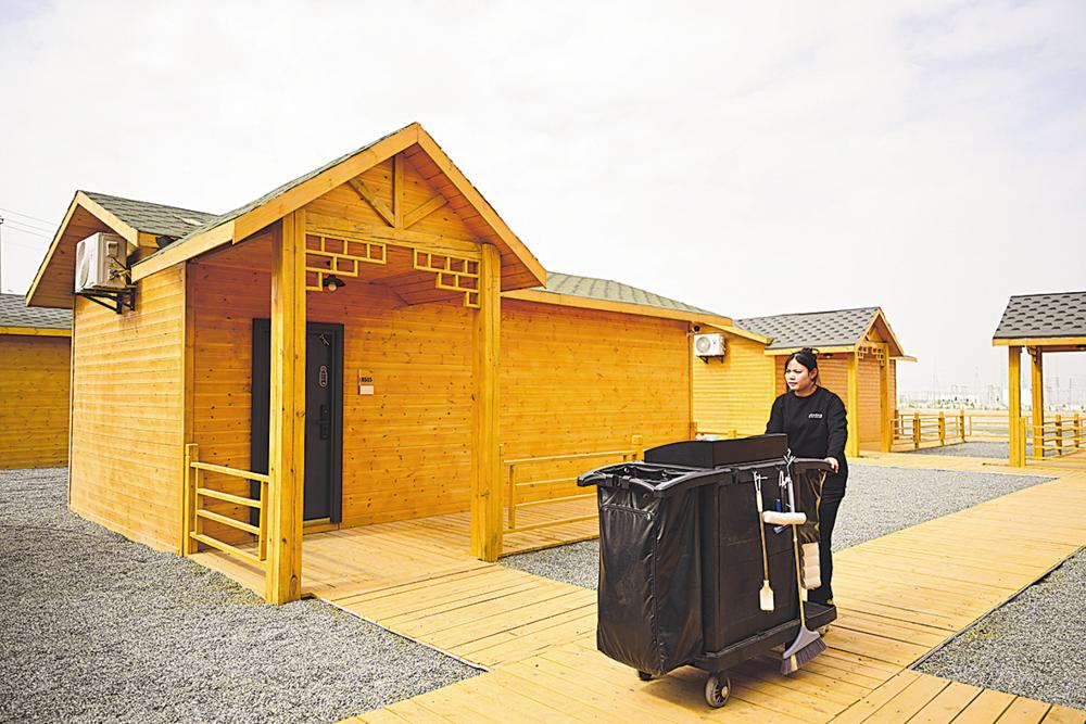 7月30日,冷湖镇一家民宿的工作人员准备清理房间。 新华社记者 张龙 摄