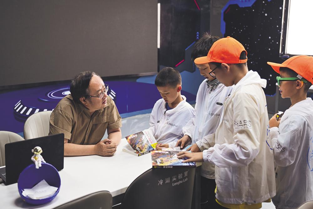 7月29日,科幻作家杨平(左一)在冷湖镇“冷湖实验室”与参加暑期研学的小朋友交流。新华社记者 张龙 摄