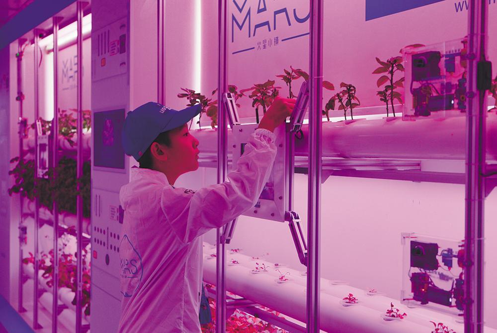 7月29日,在冷湖镇冷湖实验室,参加天文夏令营的学生查看芯片农场培育的蔬菜。新华社记者 齐芷玥 摄