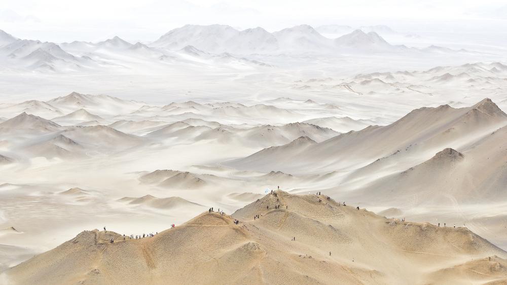 7月30日,游客在冷湖镇黑独山景区游玩(无人机照片)。 新华社记者 齐芷玥 摄
