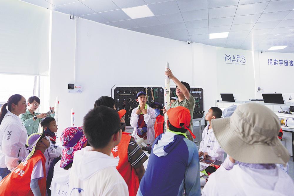 7月29日,在冷湖镇冷湖实验室,老师为天文夏令营的学生展示小火箭组装。新华社记者 齐芷玥 摄