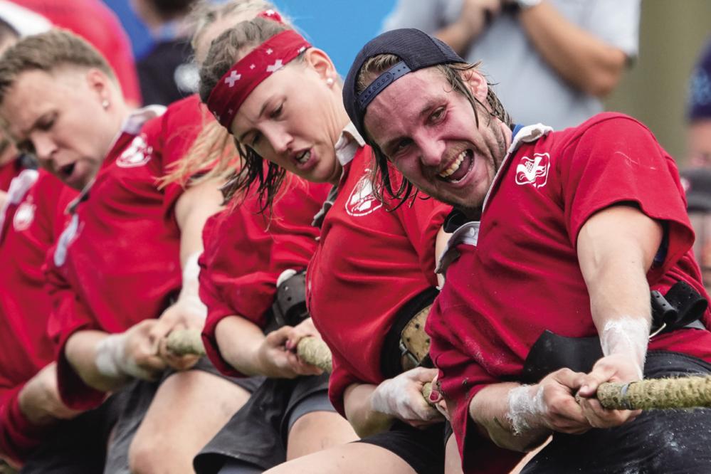 8月11日,瑞士队队员在比赛中。最终,瑞士队以3比0战胜比利时队,获得冠军。 当日,2025年成都世运会混合室外拔河580公斤级比赛在东安湖体育公园中央广场举行。新华社记者 李博 摄
