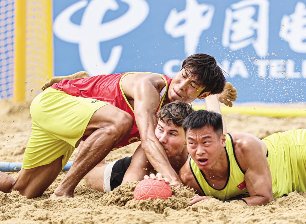 8月11日,中国队球员王凯强(左一)、杨廷庆(右一)在比赛中与丹麦队球员林德(中)拼抢。 当日,在2025年成都世运会沙滩手球男子第5-8名安慰赛半决赛中,中国队0比2不敌丹麦队。 新华社记者 刘坤 摄