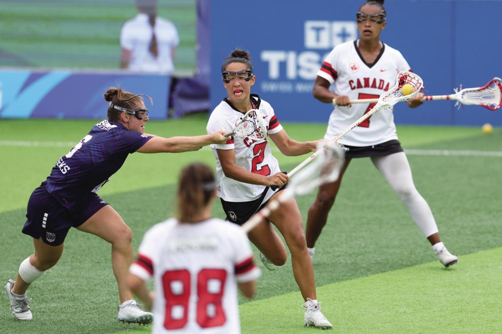 8月11日,加拿大队球员布莱克(右二)在比赛中突破。 当日,在四川省成都七中东部学校田径场举行的2025年成都世运会女子棍网球金牌赛中,美国队16比8战胜加拿大队,夺得金牌。 新华社记者 陈斌 摄