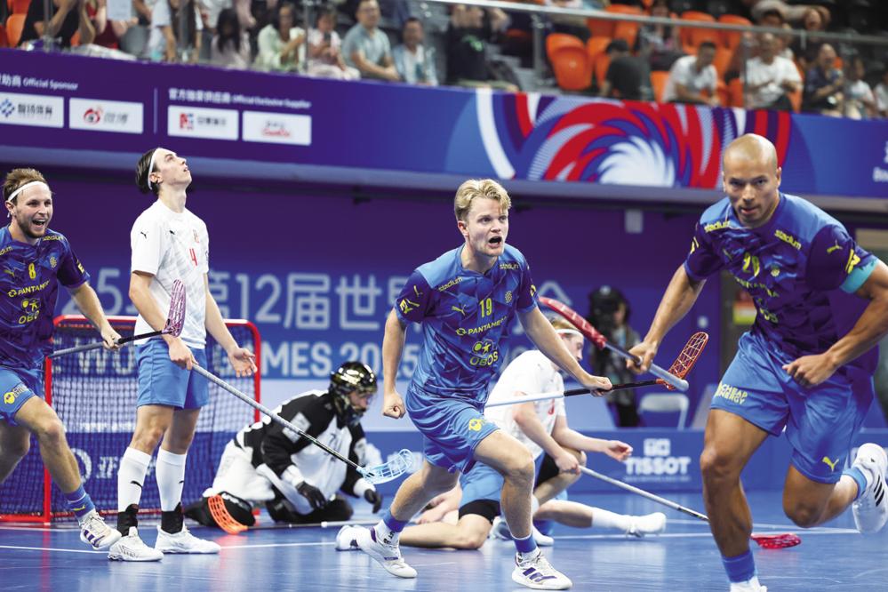 8月11日,瑞典队球员埃里克松(前右二)在比赛获胜后庆祝。 当日,在2025年成都世运会软式曲棍球男子半决赛中,瑞典队5比4战胜捷克队。新华社记者 梁旭 摄