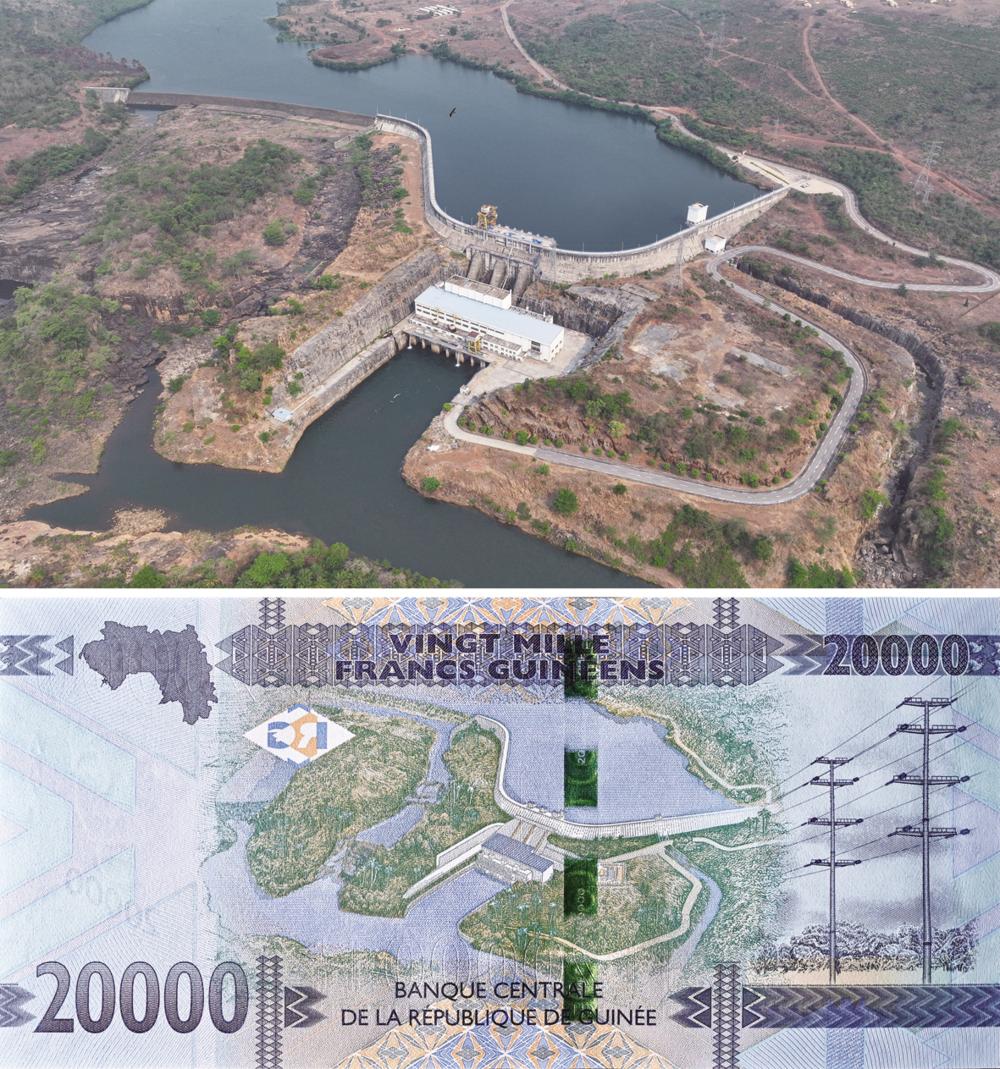 在几内亚的杜布雷卡省,从富塔贾隆高原奔流而下的孔库雷河倒映着凯乐塔水电站宏伟的坝体。水电站运行十年来,将稳定电能源源不断输送到首都科纳克里和北部山区村落。这座被印在几内亚货币上的工程,已成为中几携手发展的时代见证。 这张拼板照片展示的是:上图是4月24日在几内亚杜布雷卡省拍摄的凯乐塔水电站(无人机照片);下图是5月1日拍摄的印着凯乐塔水电站图案的2万几内亚法郎纸币。新华社记者 韩旭 摄