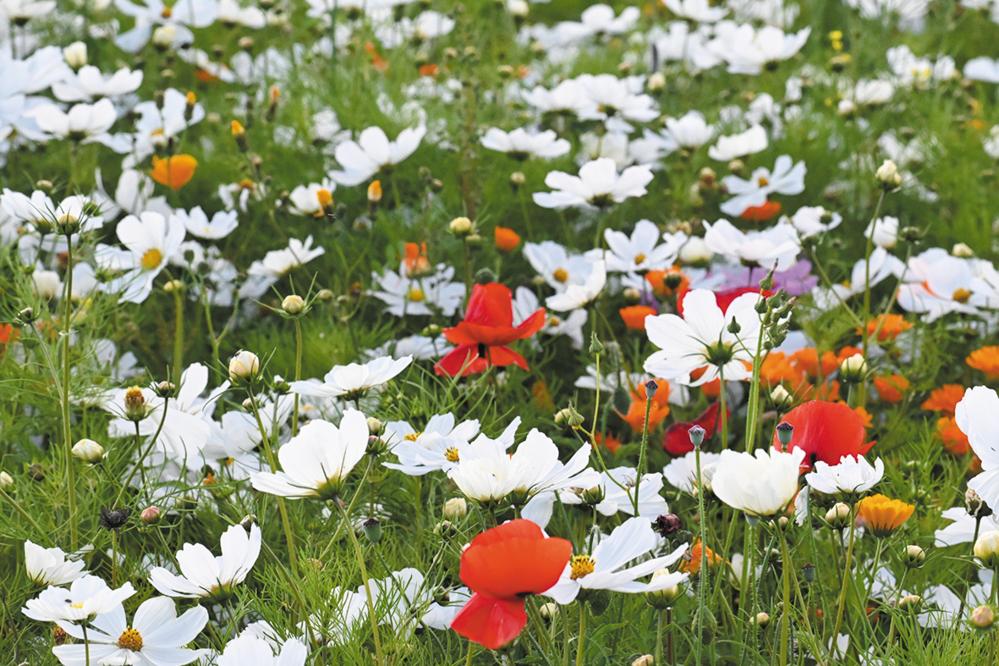 近日,德令哈市环城路两侧的数十亩花田进入盛花期。金黄、艳粉、纯白的花朵在高原阳光下尽情绽放,微风拂过,花浪翻滚如绸,香气弥漫数里,吸引了大批市民前来打卡。 为保障观赏效果,养护团队每日进行杂草清理和花田管理。同时,还增设了观景步道和休憩设施,方便游客近距离感受花海魅力。 本报记者 张萍 丁迎香 摄影报道