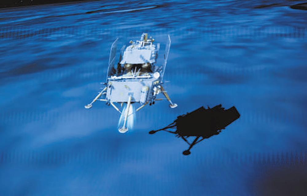 图③北京航天飞行控制中心屏幕上拍摄的嫦娥六号着陆器和上升器组合体着陆月背的模拟动画画面。
