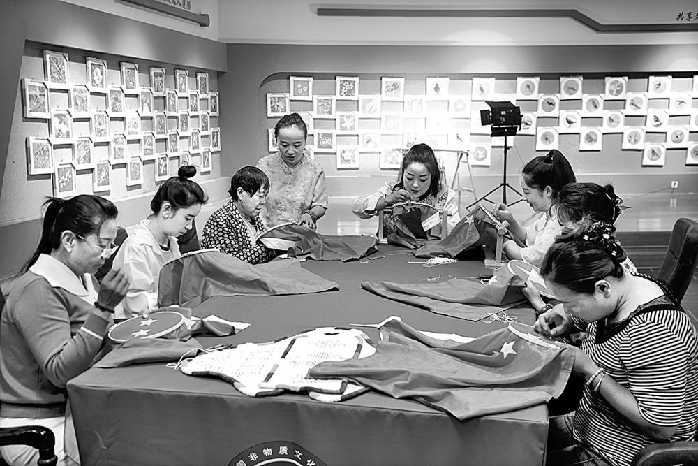 8月25日,记者在海西州民族文化活动中心非遗传承基地看到,海西蒙古族刺绣省级非遗传承人柴生莲正悉心指导绣娘绣五星红旗上的五角星。 据悉,在纪念中国人民抗日战争暨世界反法西斯战争胜利80周年阅兵式来临之际,柴生莲接到青海省妇女手工制品协会的30面国旗订单,这些饱含敬意的国旗将在9月3日的阅兵活动上赠送给抗战老兵。 本报记者 查宝音 摄影报道