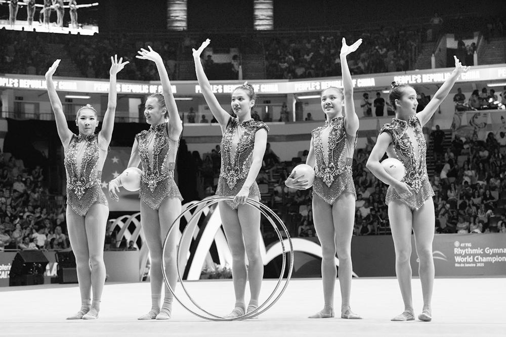 8月24日,中国队选手在比赛后向观众致意。 当日,在巴西里约热内卢举行的2025年国际体操联合会艺术体操世界锦标赛集体3球2圈决赛中,乌克兰获得冠军,巴西队获得亚军,中国队收获铜牌。 新华社发(克劳迪娅·马尔提尼 摄)