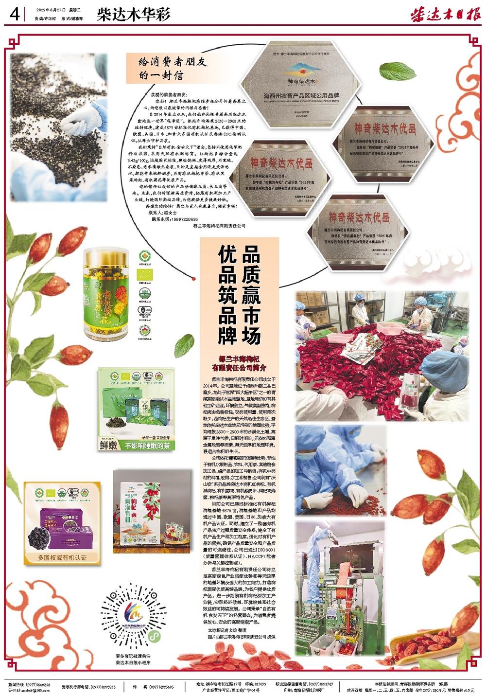 都兰丰海枸杞有限责任公司将立足高原绿色产业资源优势和得天独厚的地理环境及强大的加工能力,打造枸杞国际优质高端品牌,为客户提供优质产品。进一步拓展有机枸杞深加工产业链,实现经济效益、环境效益和社会效益的可持续发展。公司秉承“自然有机 食安天下”的经营理念,为消费者提供放心、安全的高原健康产品。