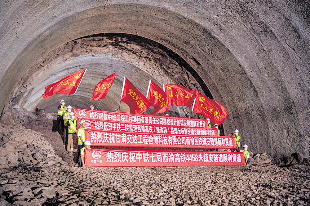 ◀8月27日,在西渝高铁镇安隧道建设施工现场,工人庆祝隧道贯通。 8月27日,由中铁七局承建的西渝高铁镇安隧道顺利贯通,该隧道位于重庆市开州区,全长4458米,是西渝高铁康渝段首个贯通的超4公里长隧道。至此,西渝高铁康渝段隧道贯通34座,隧道贯通进度已达47%。 西渝高铁是我国“八纵八横”高铁网京昆通道和包(银)海通道的重要组成部分。西渝高铁康渝段自安康西站起,经陕西省安康市,重庆市城口县,四川省达州市、广安市,重庆市合川区、北碚区,引入重庆铁路枢纽重庆西站,正线全长478公里。 新华社记者 唐奕 摄