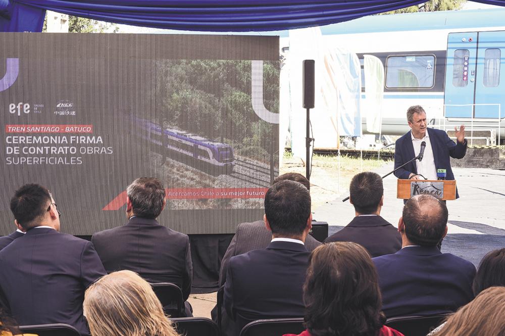 ▲8月25日,智利交通和电信部长胡安·卡洛斯·穆尼奥斯在圣地亚哥首都大区伦卡市举行的签约仪式上致辞。 中国铁建承建的智利巴图科铁路项目签约仪式25日在智利圣地亚哥首都大区伦卡市举行。新华社发(豪尔赫·比列加斯 摄)