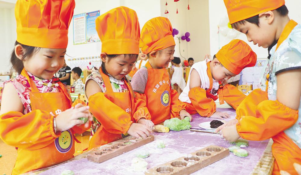 8月26日,在山东省临沂市沂南县双堠镇中心幼儿园,小朋友学做七夕巧果。 七夕将近,多地开展丰富多彩的民俗活动,传承和弘扬中华优秀传统文化。新华社发(王彦冰 摄)