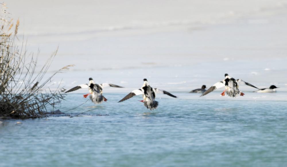 返程的路上,一幕场景让所有人都停下了脚步——两只白尾海雕稳稳地蹲在湿地冰面凸起的冰凌上,它们跟前有一汪没结冰的小水池,几只普通秋沙鸭居然就在池里慢悠悠地游着,面对近在咫尺的天敌,竟显得坦然自若。没有追逐,没有惊慌,就这么安静地共享着这片小水域。