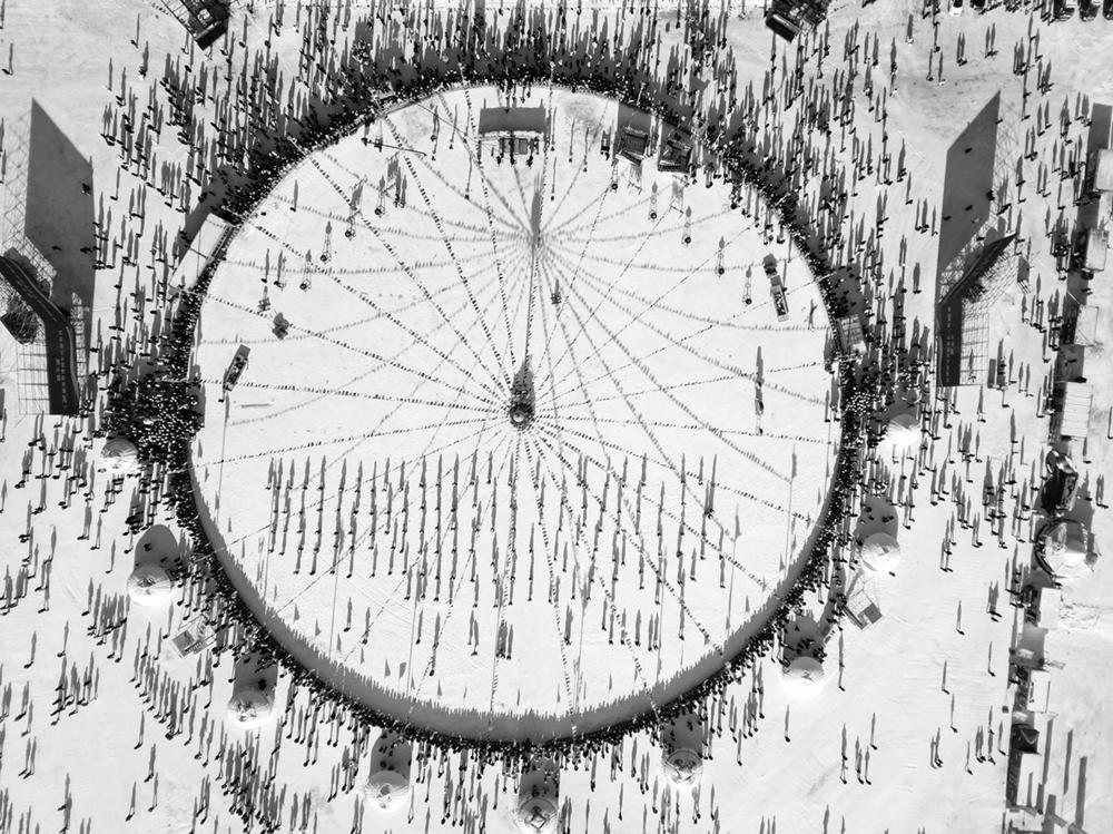 1月8日,在吉林省松原市,人们参加吉林·查干湖第24届冰雪渔猎文化旅游节开幕式(无人机照片)。 1月8日,吉林·查干湖第24届冰雪渔猎文化旅游节在捺钵广场拉开帷幕。查干湖之上,人工凿冰、马拉绞盘、冰下走网等渔猎技艺有序展开,引来各地游客。 查干湖冬捕已被认定为国家级非物质文化遗产,成为东北冰雪文化的重要标志。新华社记者 颜麟蕴 摄