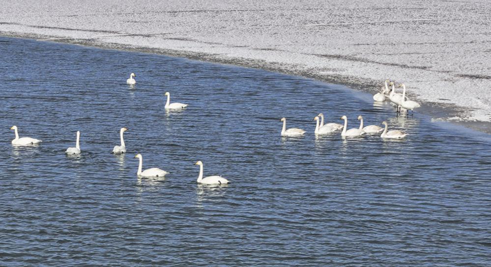 正午时分,水汽散尽,候鸟愈发活跃。湖畔芦苇轻舞,冰面倒映飞鸟,天鹅嬉戏、水鸟翩飞,构成一幅人与自然和谐共生的冬日画卷。随着生态保护力度持续加大,这片高原净土正以愈发优美的姿态,书写着人与自然和谐共生的新篇章。