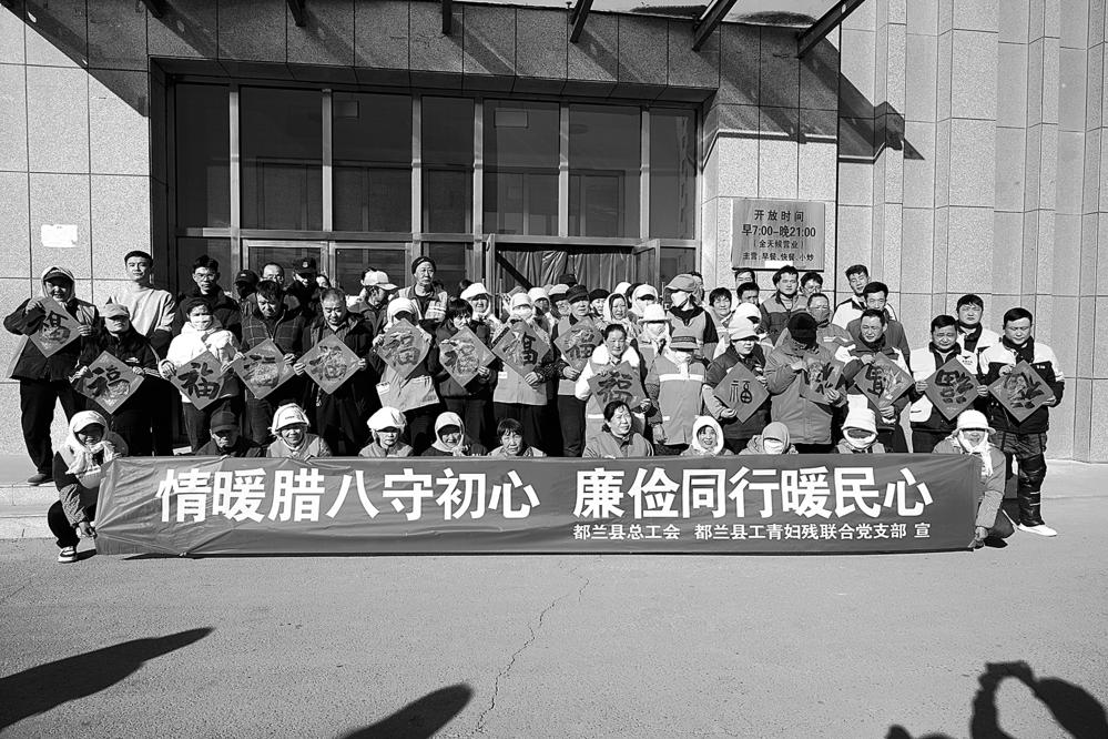 本报讯(记者 孙丹丹) 深冬的都兰寒意渐浓,却有一股暖流在一线劳动者间涌动,都兰县总工会打造“廉政文化润心+新春送福传情+民俗美食共享”腊八节系列主题活动,为全县90多名快递员、外卖配送员、环卫工人等户外劳动者,送上兼具思想引领与民生温度的“冬日暖心礼包”,用实际行动诠释职工群众“娘家人”的担当与温情。