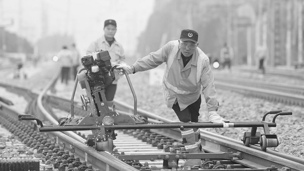 1月29日,中国铁路南宁局集团有限公司百色工务段八渡线路车间工人在进行钢轨打磨作业。 2026年春运大幕即将拉开,各地铁路部门加强设施设备维修巡检,全力守护春运安全。新华社记者 张爱林 摄