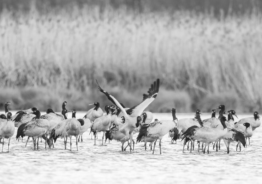 1月29日在贵州草海国家级自然保护区拍摄的越冬的黑颈鹤。 冬日,地处贵州省毕节市威宁县的草海国家级自然保护区呈现万鸟翔集的生态美景,黑颈鹤、灰鹤以及斑头雁等大批候鸟来此越冬。 新华社记者 杨文斌 摄