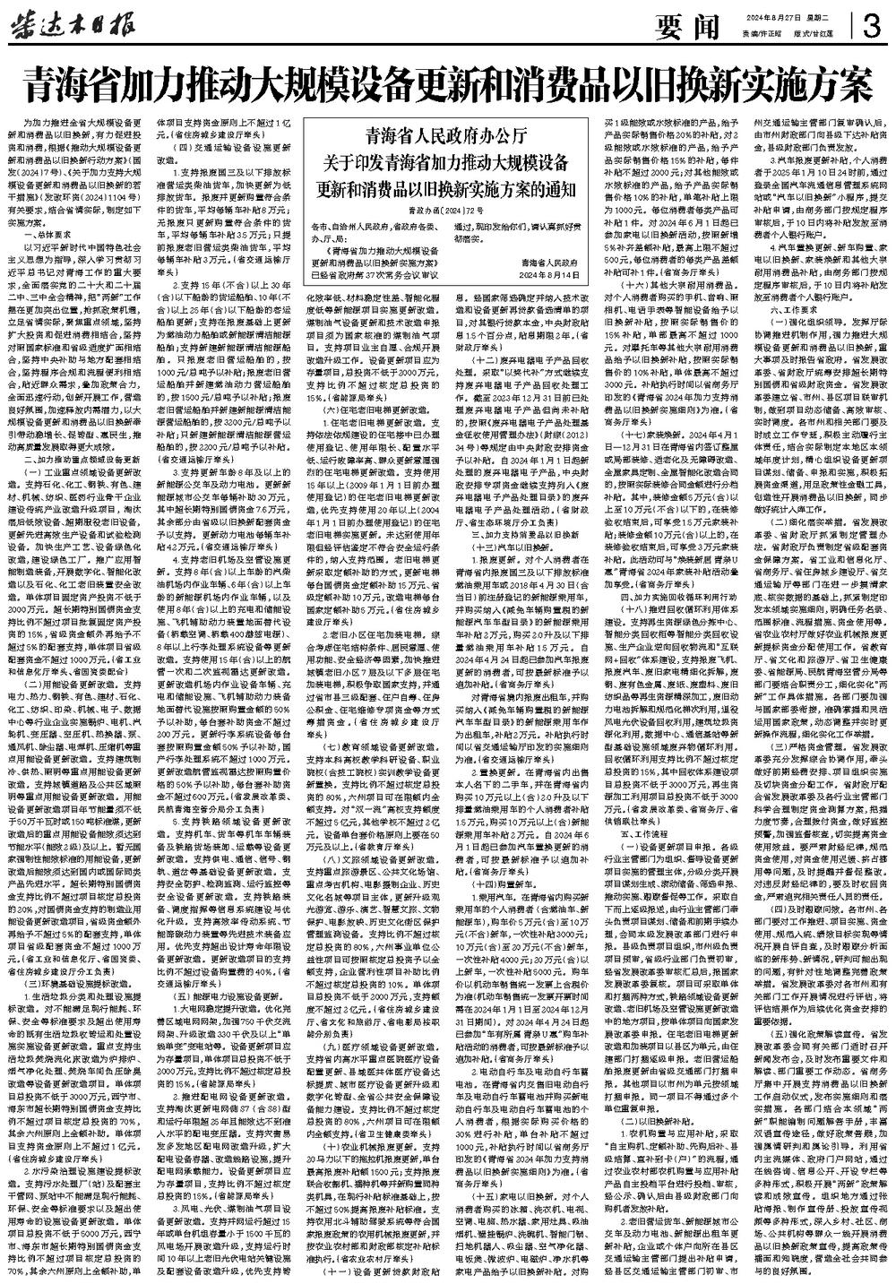 青海省加力推动大规模设备更新和消费品以旧换新实施方案
