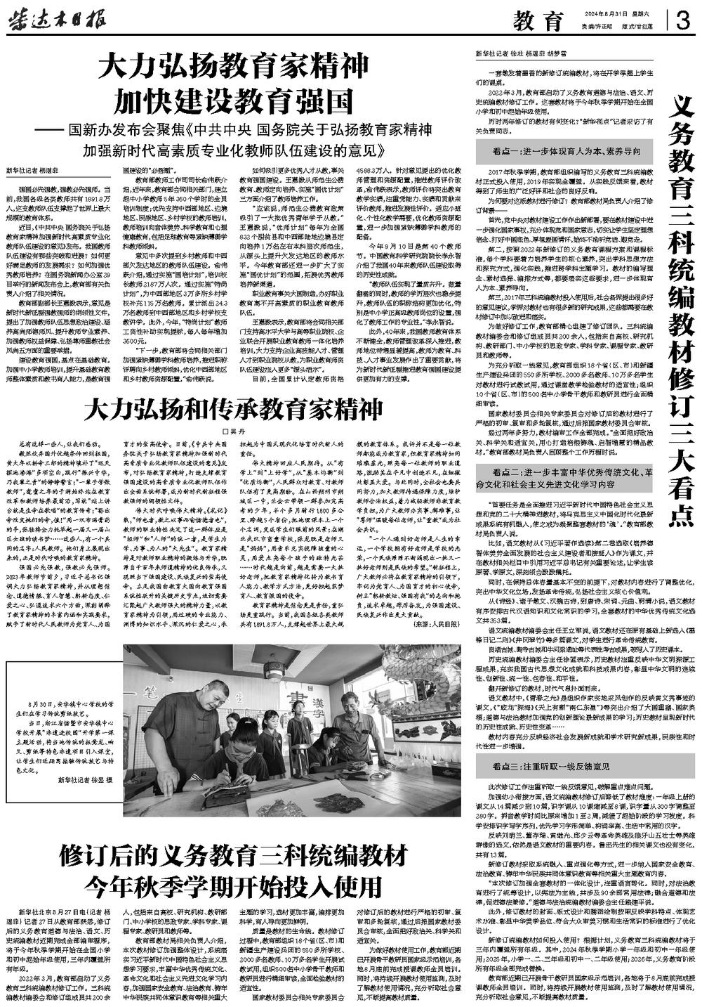 修订后的义务教育三科统编教材 今年秋季学期开始投入使用