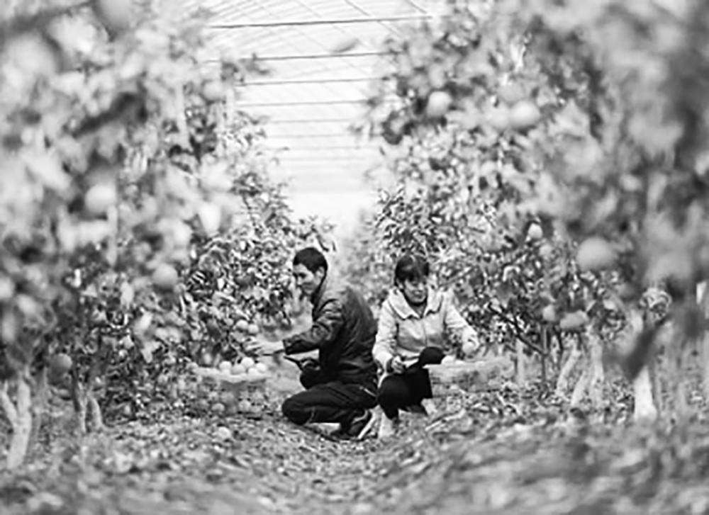 ◀ 安徽省铜陵市灰河乡东风村甜蜜生态园家庭农场,果农忙着采摘果冻橙。 陈磊摄(影像中国)