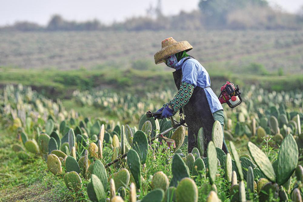 2月20日,工作人员在中美墨仙人掌种植基地劳作。
