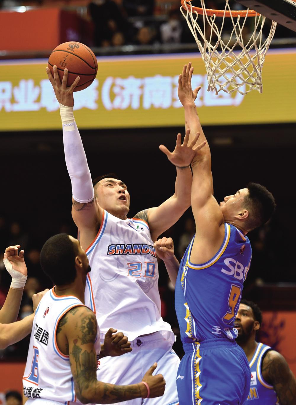 当日,在2022-2023赛季中国男子篮球职业联赛(CBA)常规赛第34轮比赛中,山东高速队主场以109比87战胜福建浔兴股份队。 新华社记者 徐速绘 摄