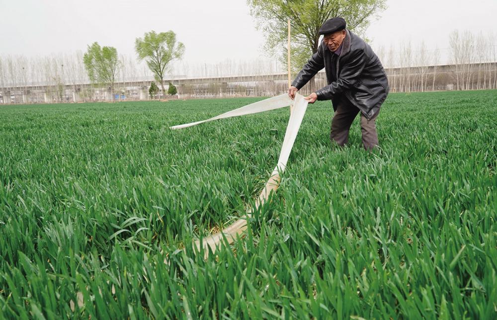 ▶ 3月15日,在山东省菏泽市牡丹区,村民铺设水管,为小麦浇“返青水”。