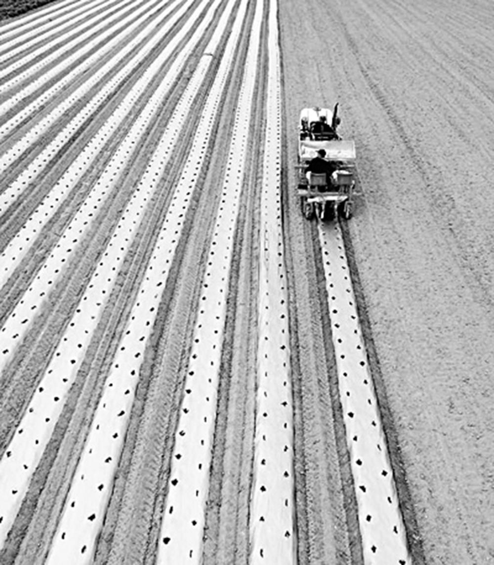 安徽省亳州市谯城区芦庙镇王楼村新品种辣椒种植试验基地,农民驾驶覆膜机同步完成覆膜、喷药、铺滴灌带、盖土、打孔等工作。