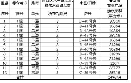 中国农业银行海西分行现有旺铺12套拟整体出售,面积2498.54平方米,位于德令哈市景华湾商业广场2层(9套)、3层(3套),商业繁华、交通便利,详情请垂询李经理,联系电话:13709779005,石经理,联系电话:18297271366。房屋信息如下: