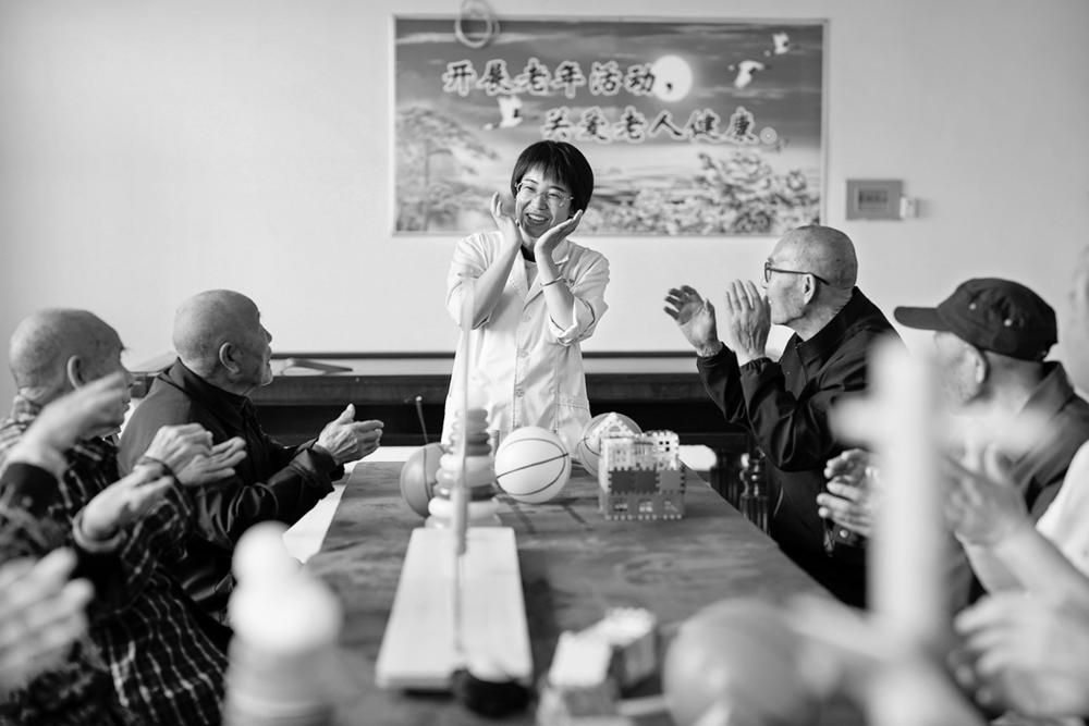 近日,河北省滦南县一家养老机构的工作人员在陪老人做益智游戏。