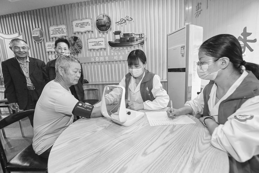 近日,志愿者在织里镇晟舍村居家养老服务中心为老人进行健康体检。