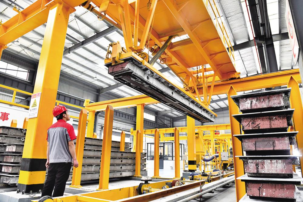 5月28日,在嘉祥县国家级装配式建筑产业园,工人在生产线上操作机械,加工装配式建材混凝土砌块。