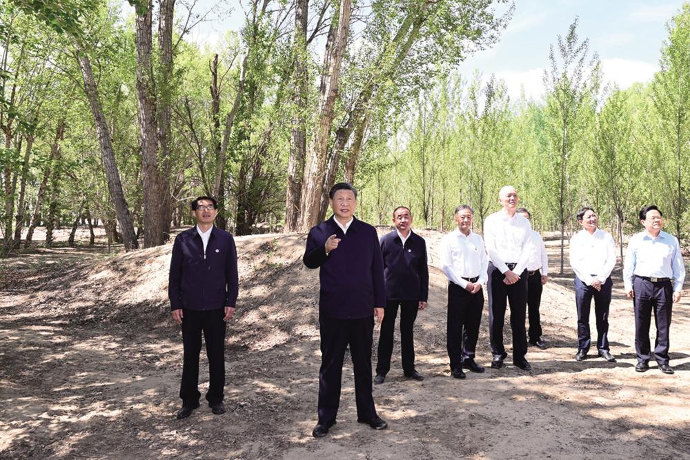 6月5日至6日,中共中央总书记、国家主席、中央军委主席习近平在内蒙古巴彦淖尔考察,并主持召开加强荒漠化综合防治和推进“三北”等重点生态工程建设座谈会。这是6日上午,习近平在临河区国营新华林场考察。新华社记者 谢环驰 摄