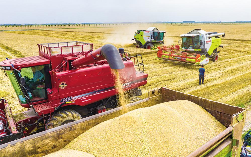 “三夏”时节,在河南省驻马店市西平县老王坡高标准农田,农机手操作大型收割机收割小麦,田间地头一派忙碌景象。 新华社发(赵永涛 摄)