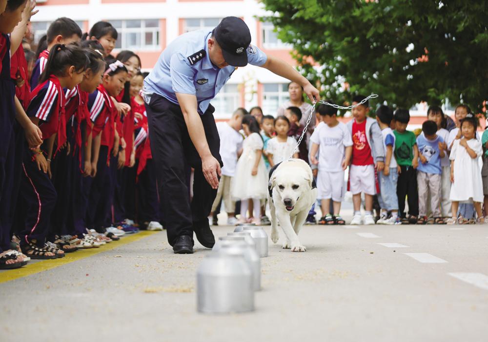 6月25日,山东省沂南县公安局在辛集镇中心小学开展禁毒主题宣传活动,给小朋友演示缉毒犬嗅毒。