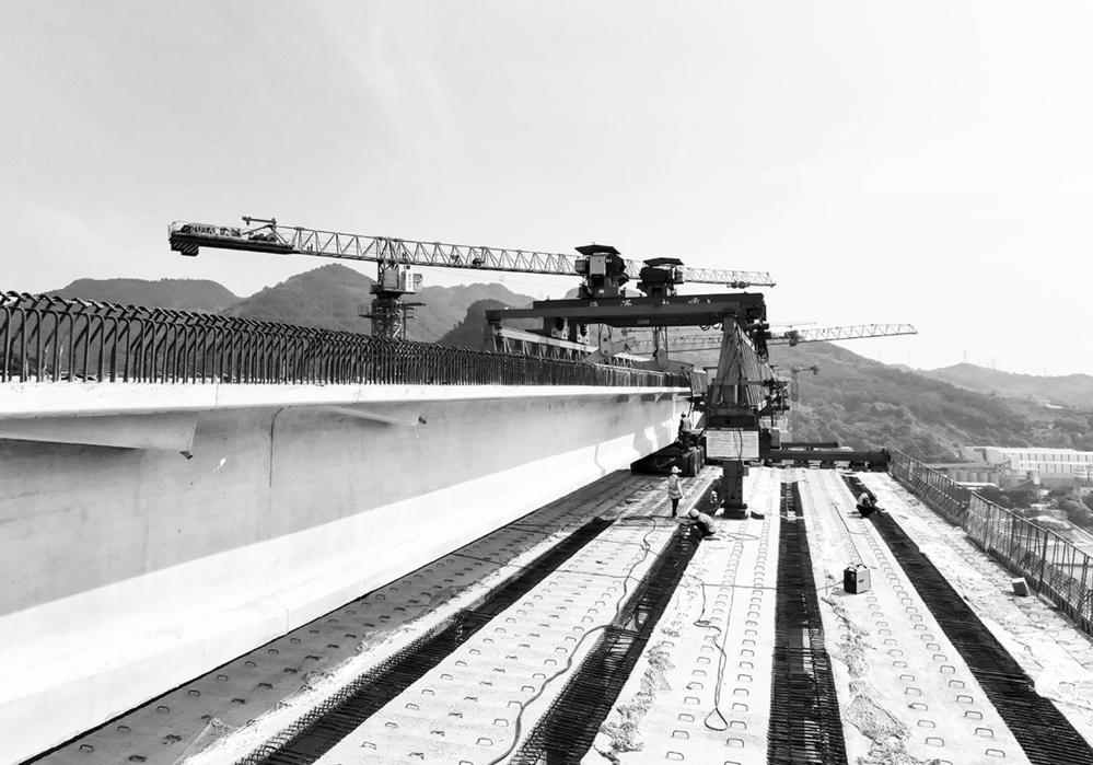 7月10日,施工人员在重庆市北碚区渝武高速复线观音峡嘉陵江特大桥架设引桥T梁(无人机照片)。 连日来,重庆渝武高速公路复线控制性工程观音峡嘉陵江特大桥引桥T梁架设全面展开,预计今年内全桥可实现贯通。观音峡嘉陵江特大桥位于重庆市北碚区,大桥主跨235米。新华社发(秦廷富 摄)