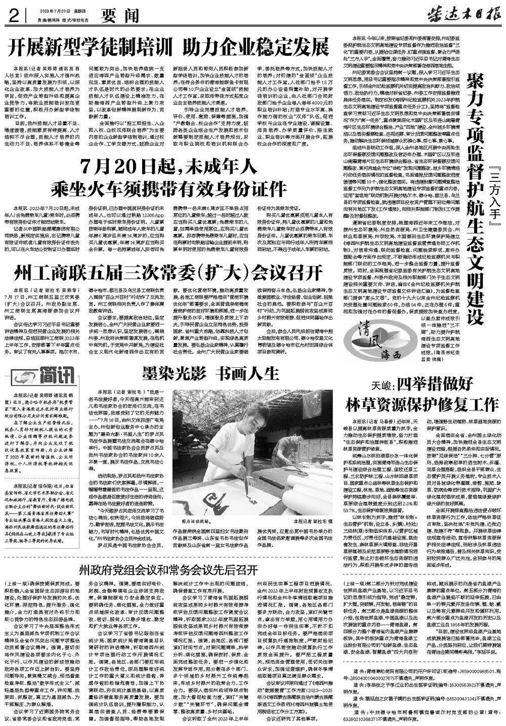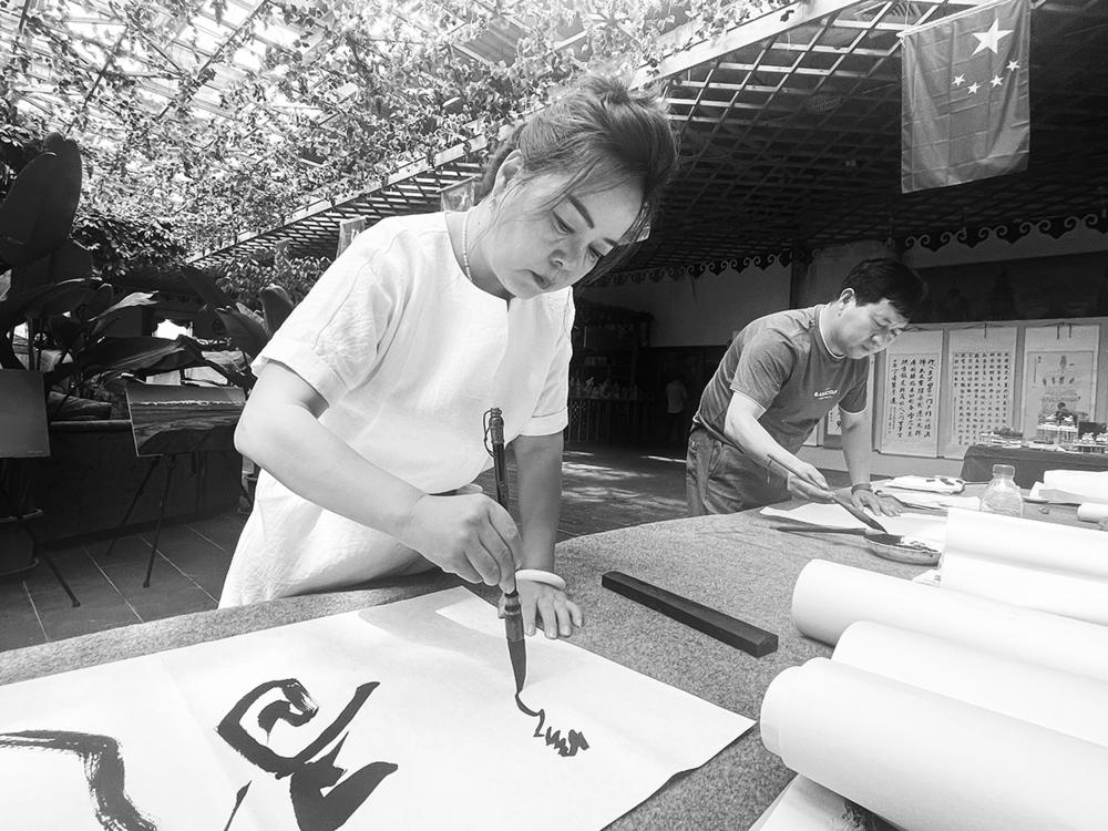 本报讯 (记者 谢拉毛 ) “我是一名书法爱好者,今天很高兴能来到这儿和书法家协会的老师们交流,在书法世界里,我感受到了它的无穷魅力……”7月18日,由州文体旅游广电局主办,州创新创业服务中心承办的主题为“墨染光影·书画人生”的罗占凤书法作品展暨书法交流笔会在德令哈举行。中国书法家协会会员罗占凤及我州书法家协会的书法家共10余人齐聚一堂,展示书法作品、交流书法心得。
