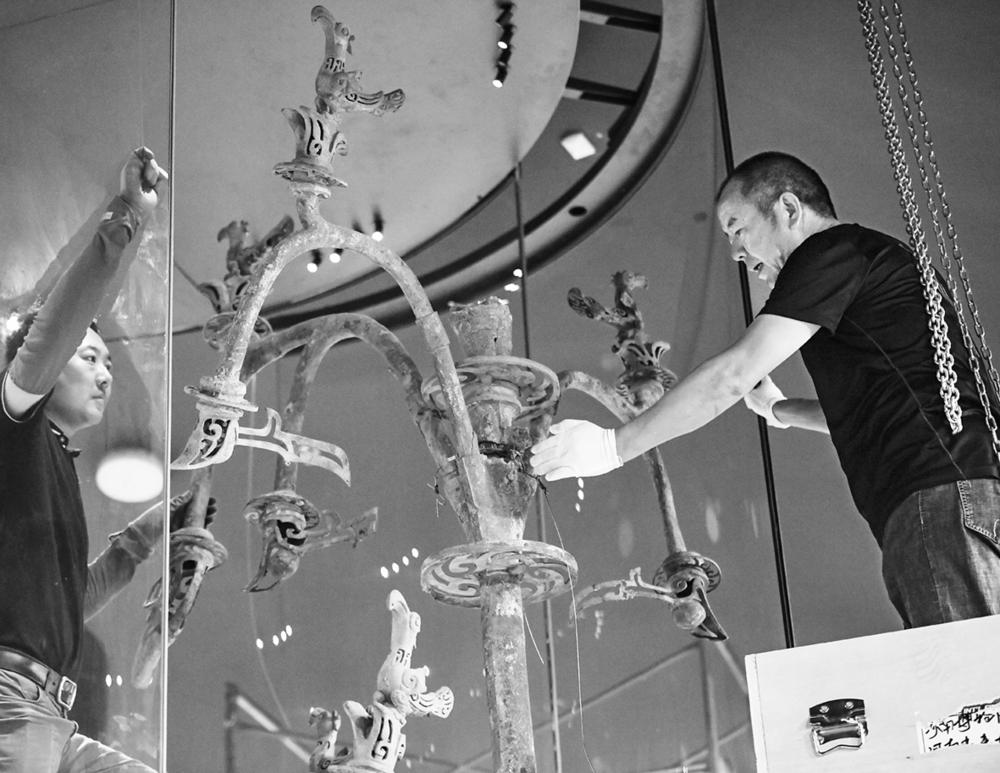 三星堆博物馆镇馆之宝“搬新家” 在三星堆博物馆老馆,工作人员准备搬迁Ⅰ号大型铜神树(7月16日摄)。 经过一个多月时间的闭馆后,7月27日,三星堆博物馆新馆在四川德阳广汉市试运行,一大批珍贵文物再次与公众见面。其中,高3.96米、重360斤的Ⅰ号大型铜神树是三星堆的“镇馆之宝”,也是新馆的“压轴之作”。在充分讨论搬迁方案后,工作人员用两天时间成功完成了它的保护性固定、分离、转运、入库等环节,并在新馆试运行后正式展出。新华社记者 王曦 摄