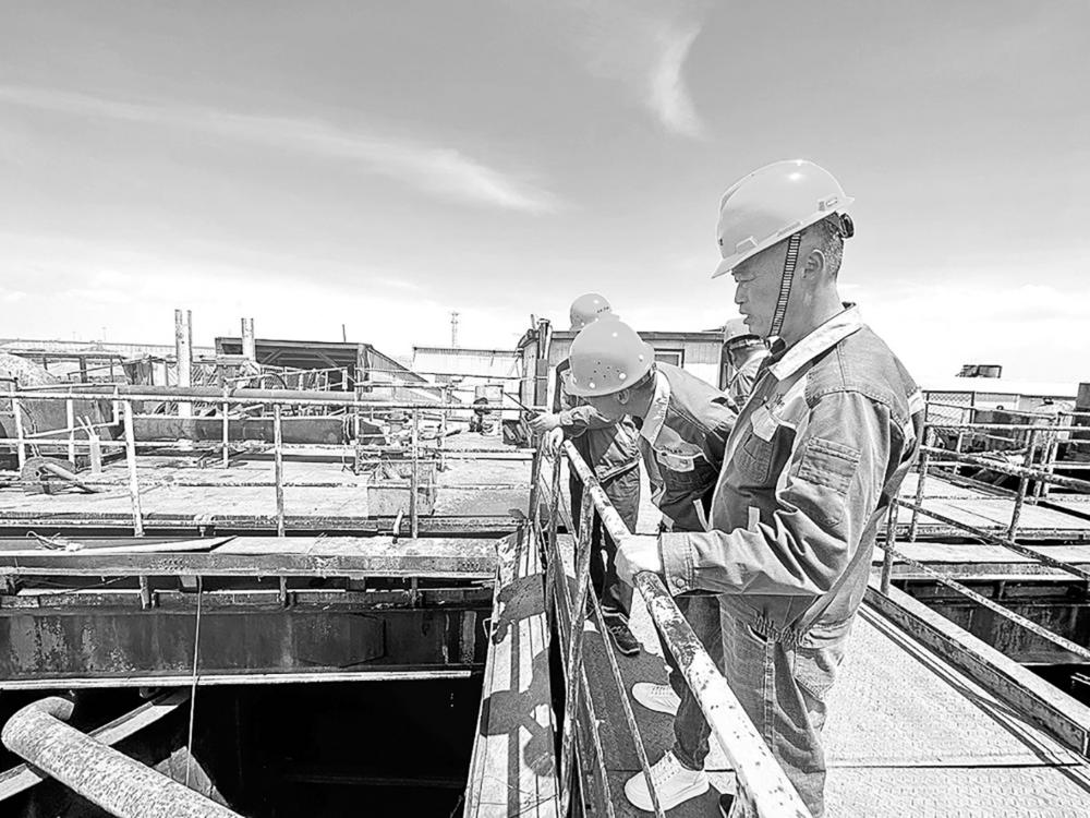生产的连续稳定,离不开设备的正常运行,尤其是在生产的黄金季节,设备的“安、稳、长、满、优”直接关系到生产任务能否完成。在生产四车间热熔装置浓密机旁,车间钳工刘铎松正在巡检设备,每一个小时就要巡检一次。