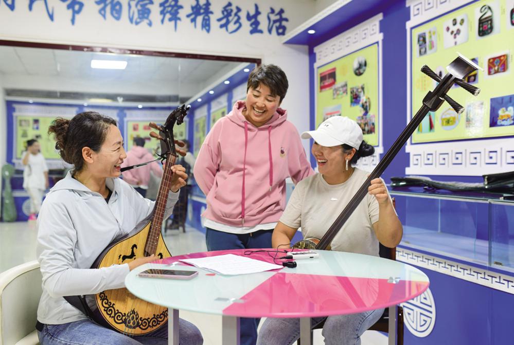 8月26日,在鄂托克前旗上海庙镇阿勒台嘎查文化活动中心美育课堂上,农牧民交流乐器演奏技艺。